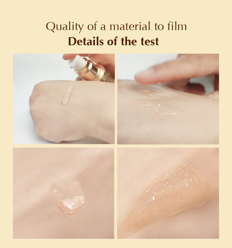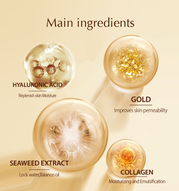 Distilled water, Hyaluronic acid, Vitamin C, 24k Gold,Silk peptide,Ginseng extract, Wheat Protein,Carbomer,Pearl Extract,Collagen,Seaweed extract,etc