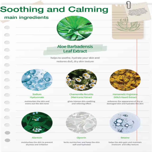 Water, propylene glycol, glycerin,butanediol, allantoin, hydroxyethyl cellulose, aloe barbadensis extract, purslane (Portulaca oleracea) extract, opuntia dillenii extract, verbena officinalis extract, carbomer, bis (hydroxymethyl) imidazolidinyl urea, triethanolamine, PEG-40 hydrogenated castor oil, EDTA disodium, phenoxyethanol, (daily) essence, polyethylene glycol -10, methyl isothiazolinone, iodopropyynol butyl carbamate, polysorbate -60, sodium hyaluronate, trehalose, disodium hydrogen phosphate, hydrolyzed silk, sodium dihydrogen phosphate